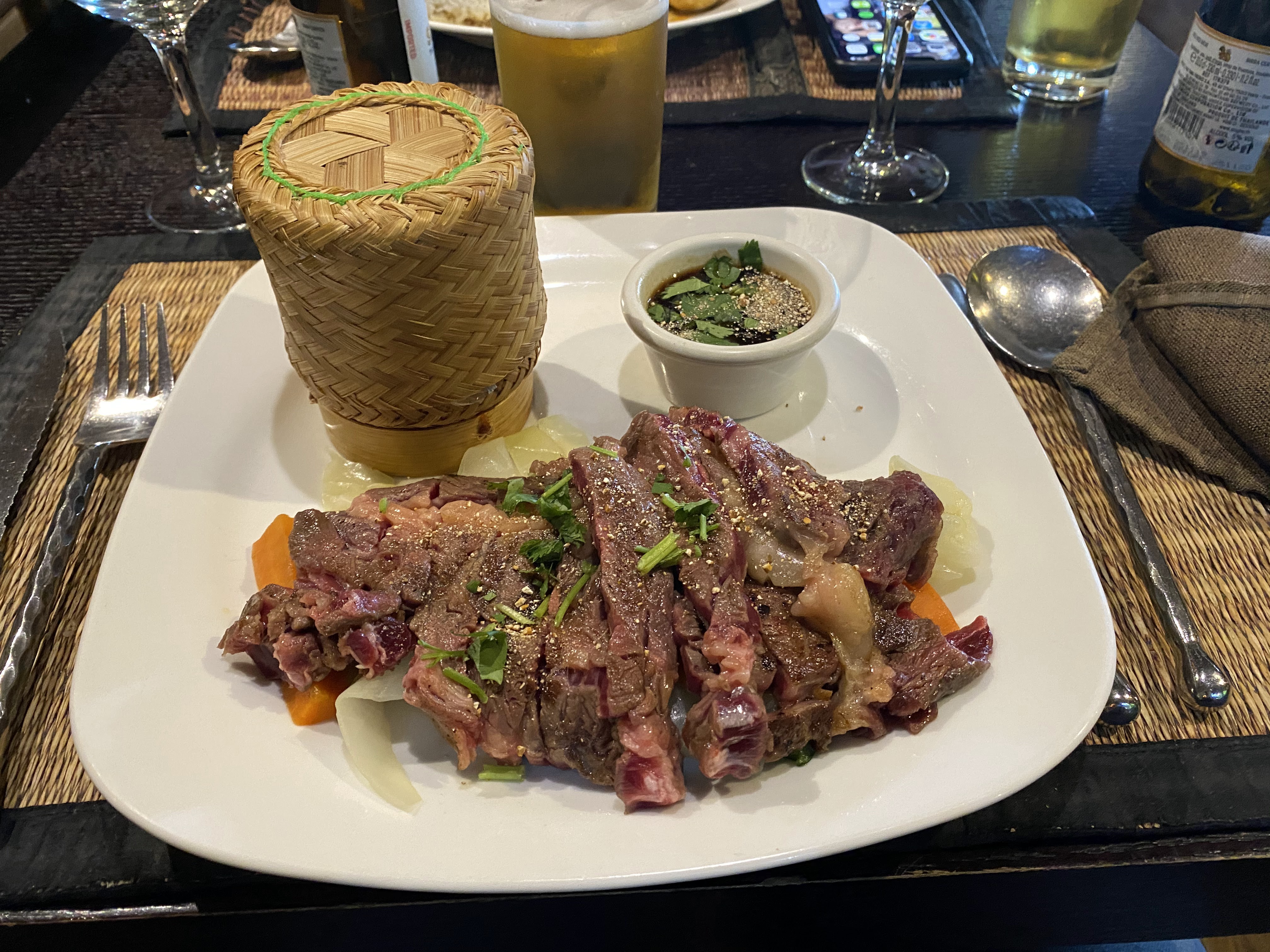 Tout est dans limage avec ce restaurant. Si vous cherchez un endroit très bien décoré, avec des plats bien présentés et une carte qui en jette pour vos repas daffaires ou impressioner une conquête, lendroit est idéal. Par contre si vous voulez manger Thaï, passez votre chemin. En plus dêtre chers, les plats que nous avons testés avaient peu de goût sans être mauvais pour autant.Le Tigre qui pleure ne piquait pas, et même après avoir demandé une sauce plus relevée, ça restait très doux (et nous supportons pourtant mal les choses trop épicées !). Cest dommage car une fois encore lassiette était très bien présentée et la viande avait lair dêtre un très bon morceau.