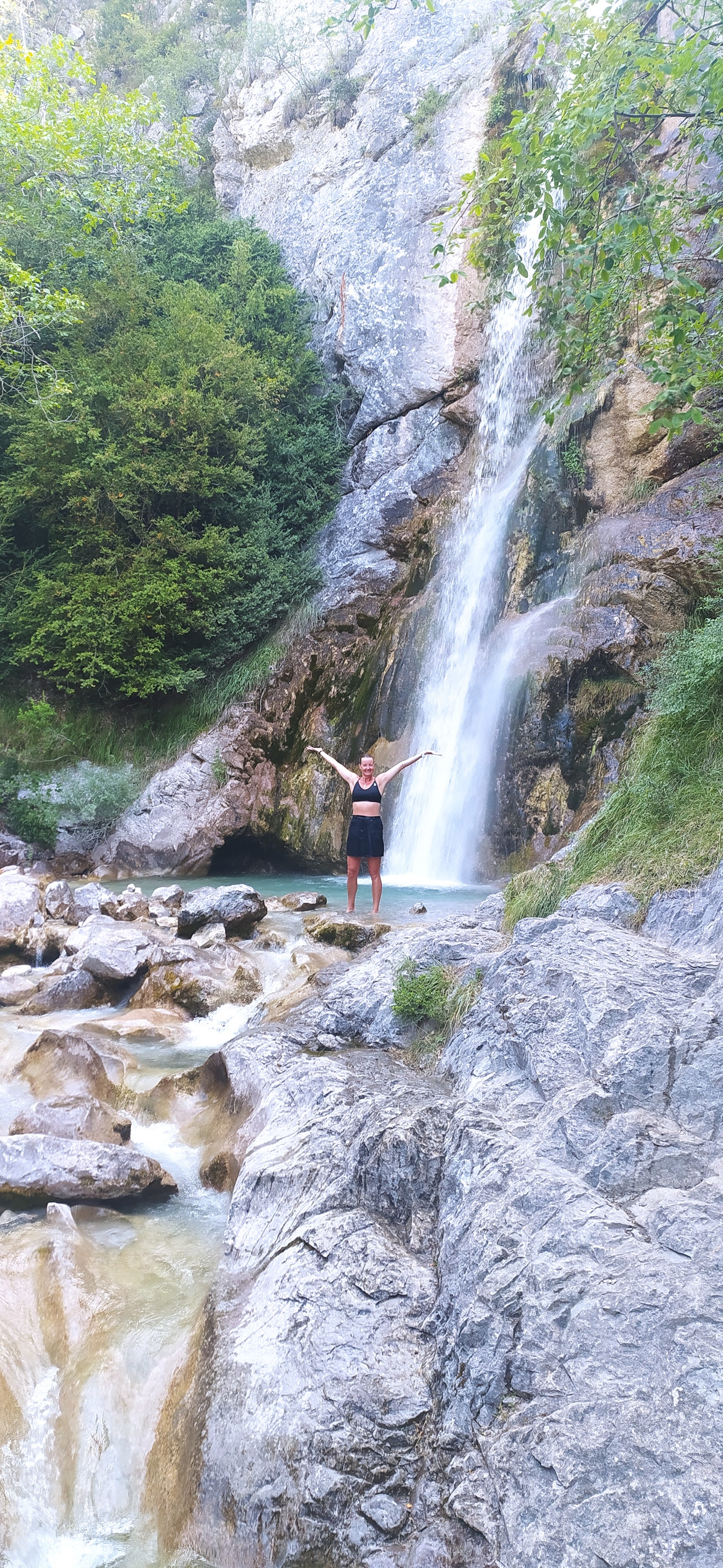 Après une petite marche en suivant le ruisseau, le bruit nous informe que la cascade nest pas loin. En ce mois daoût elle est assez impressionnante. Leau est glaciale et il ny a pas beaucoup de place pour se poser. Mais cela vaut le détour. Pensez aux chaussures deau!