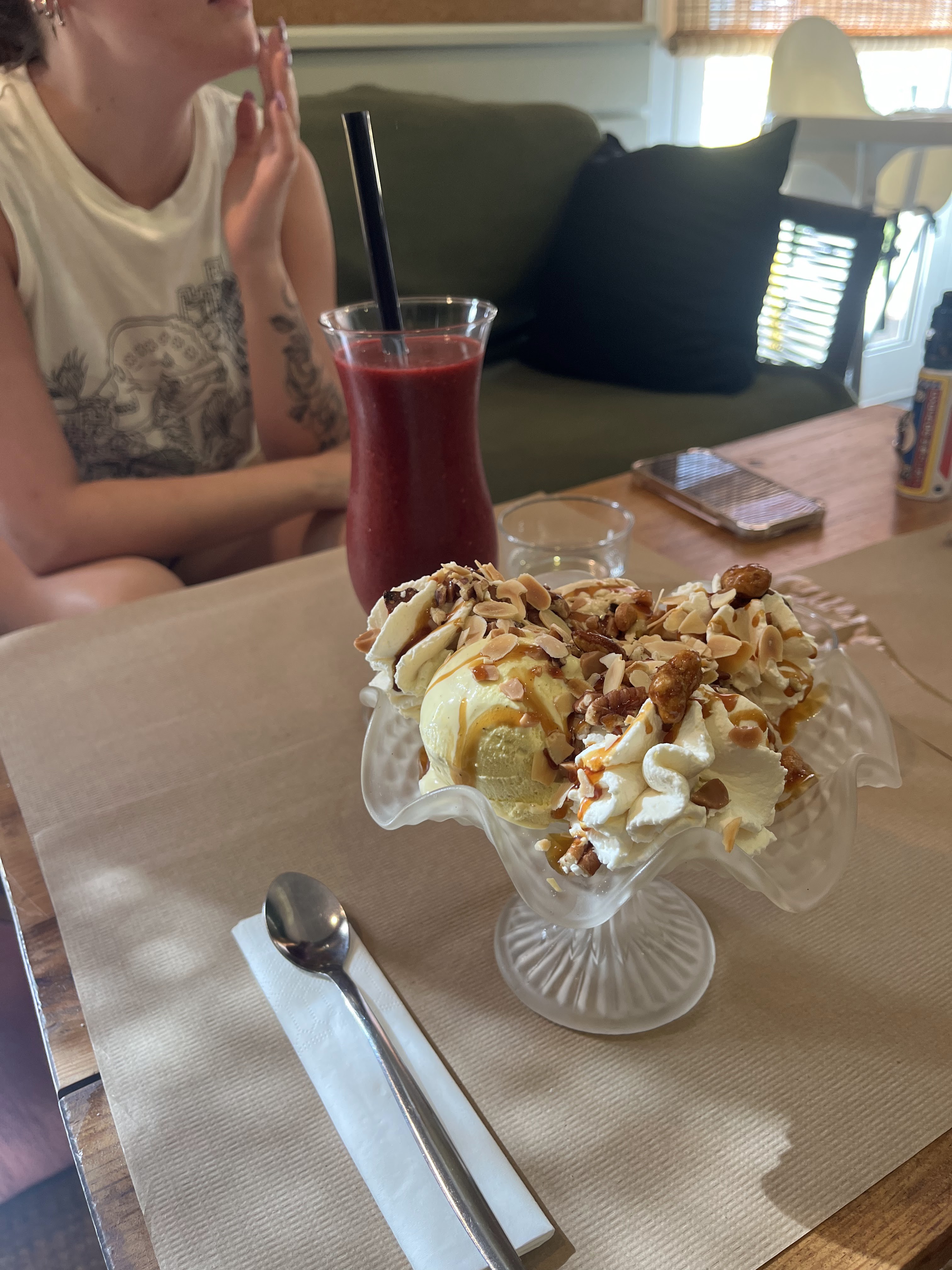 Nous y avons mangé deux fois en deux jours tellement c’était parfait. Un après midi pour le goûter et le soir suivant pour le dessert. Le service est top, sympa et chaleureux. Et tout ce que nous avons goûté était délicieux : smoothie, coupe glacée, et assiette glacée ! Rien à redire.
