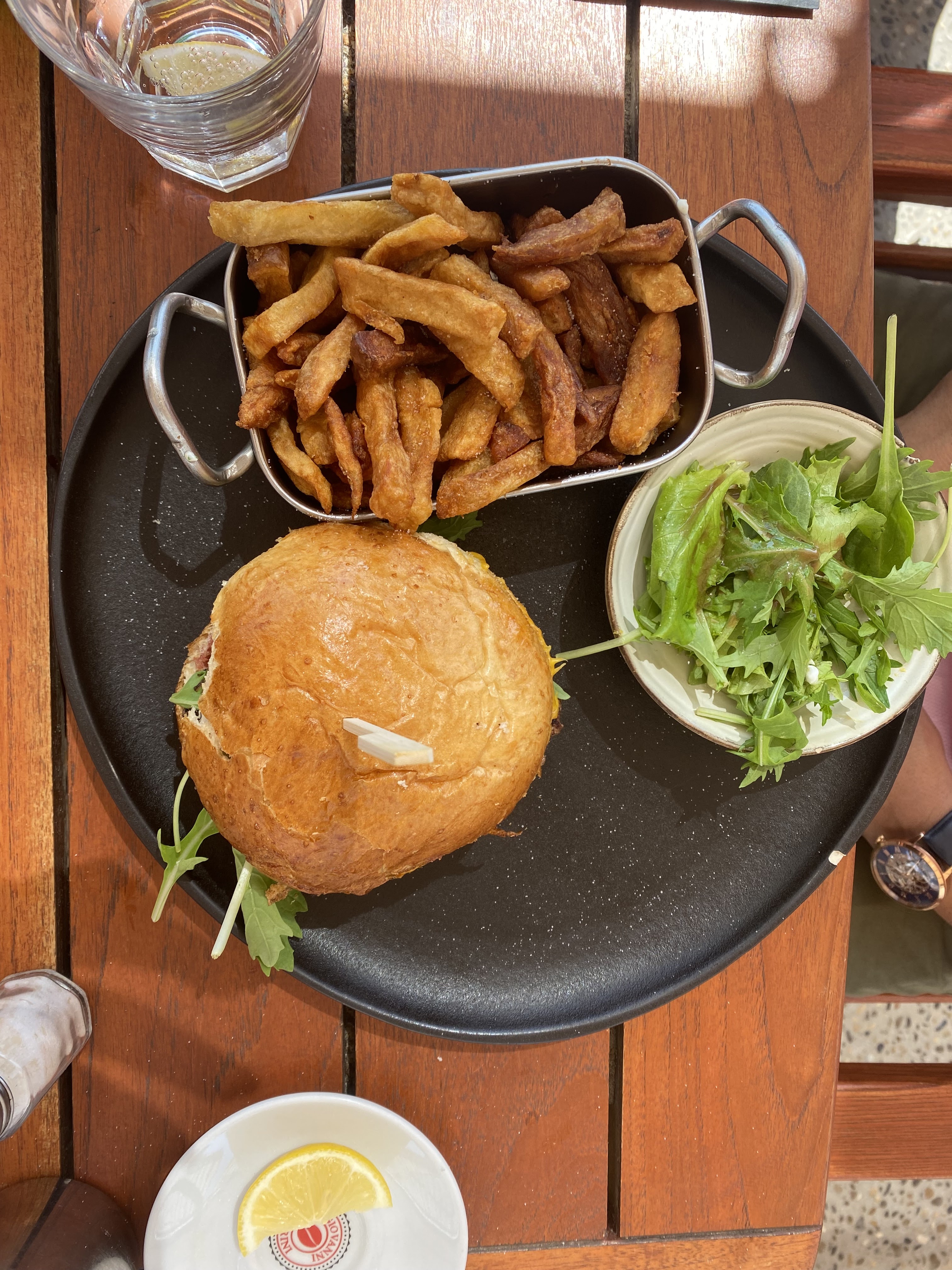 Je recommande ce restaurant avec une très belle exposition face à la mer. 1) La pièce de boucher était savoureuse. Servie avec des frites et salades ok. BBQ burger idem. 2) les desserts sont très copieux et délicieux. Le café gourmand est un VRAI café gourmand avec 4 VRAIS desserts. Les profiteroles sont magnifiques: deux énormes chous glacés avec de la chantilly à profusion. 3) Le rapport qualité prix est correct pour les plats et excellent pour les desserts. 4) Le service est courtois et efficace.