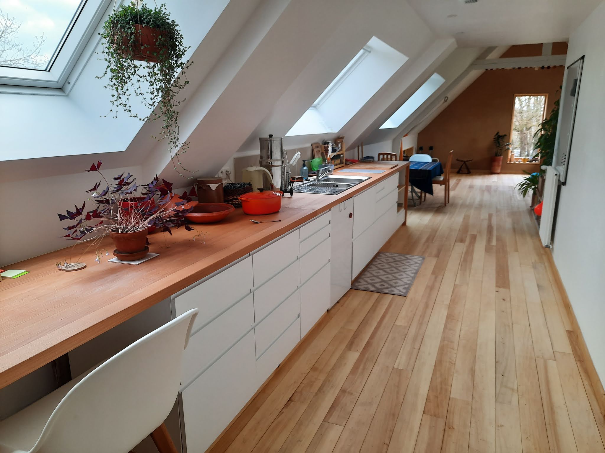 Du bois de qualité travaillé des professionnels expérimentés. Le parquet en chêne rouge et les plan de travail en grande largeur nous ont facilité la réalisation daménagements intérieurs chaleureux.
